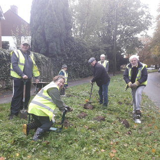 This morning volunteers continued planting the field of daffodils along the bank at Sutton Lane leading into the village. They planted 1000 bulbs in the rain, working hard and having fun.